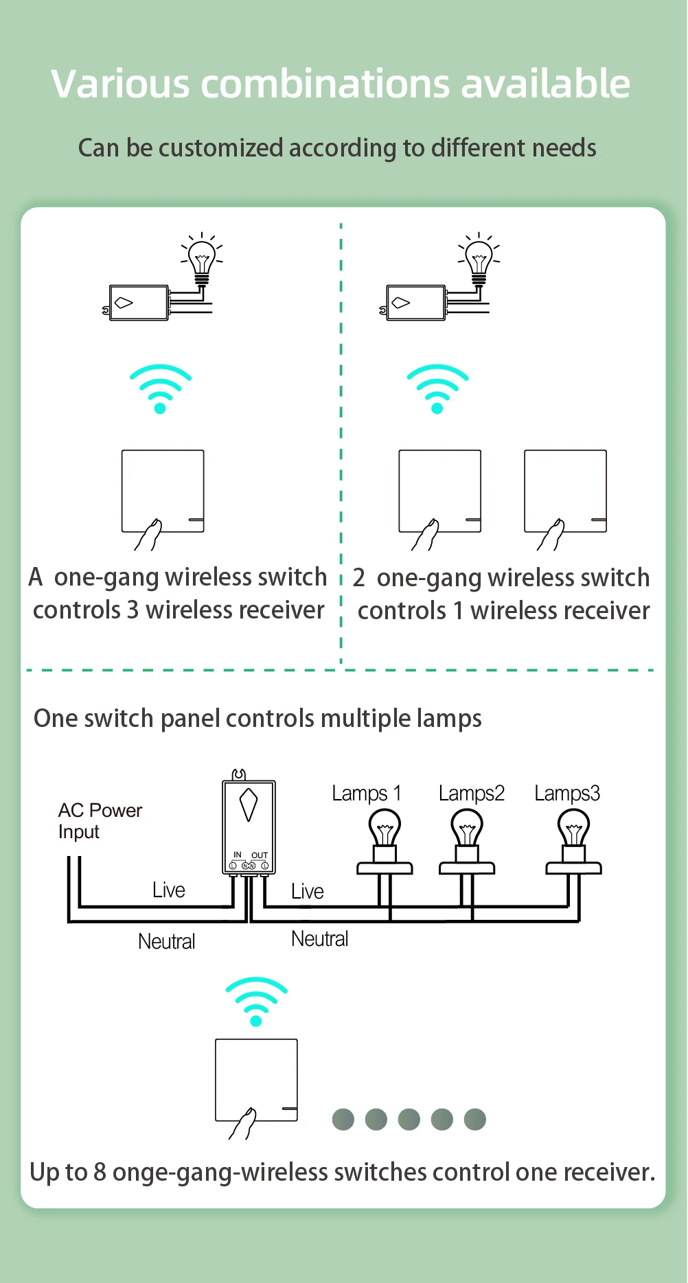 Pvz. Laiptinėse, koridoriuose ir kituose patalpose. Maksimaliai vienam įrenginiui galima prijungti iki 8 belaidžių jungiklių.
