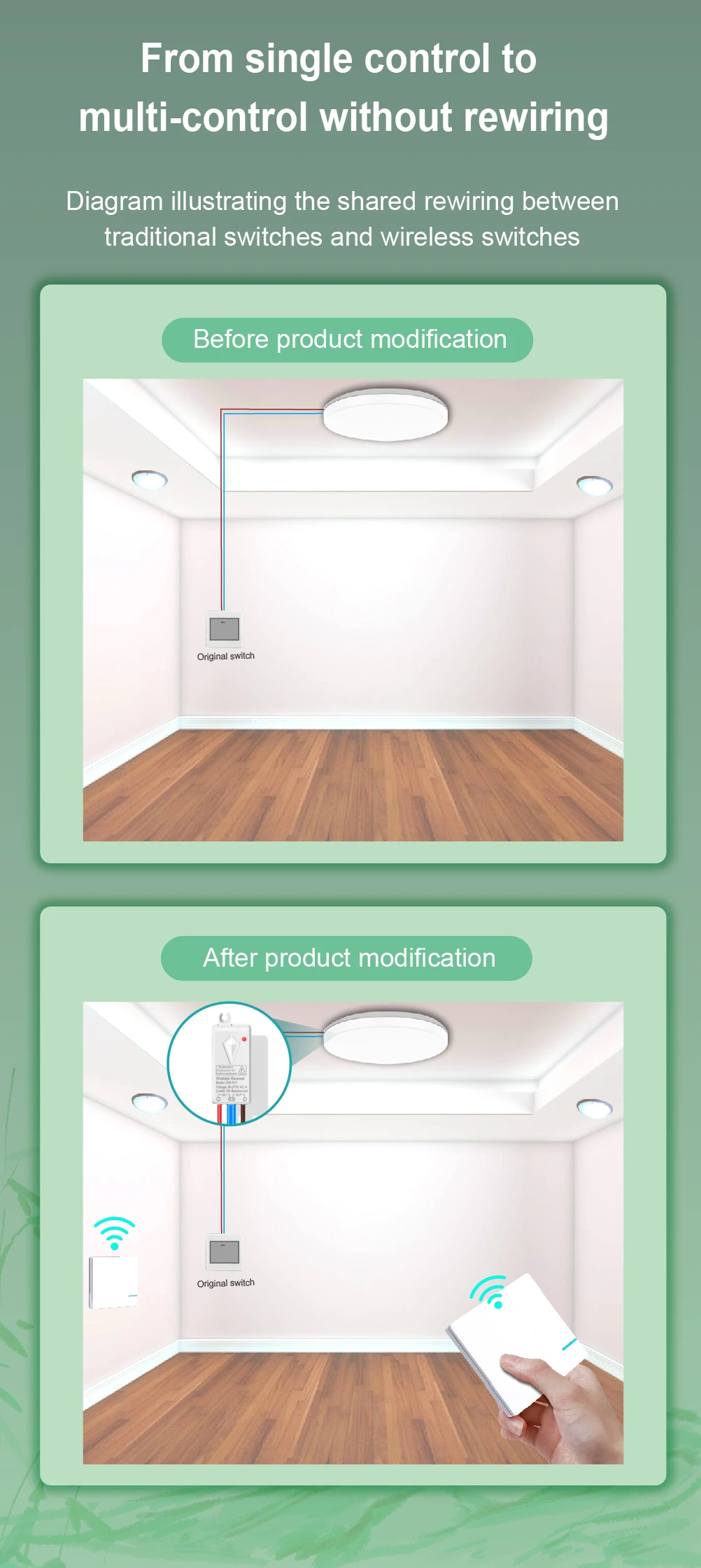 Belaidžio jungiklio pagalba galima be didelių investicijų (elektros instaliacijos keitimo) valdyti apšvietimą ar kitą įranga iš kelių vietų.