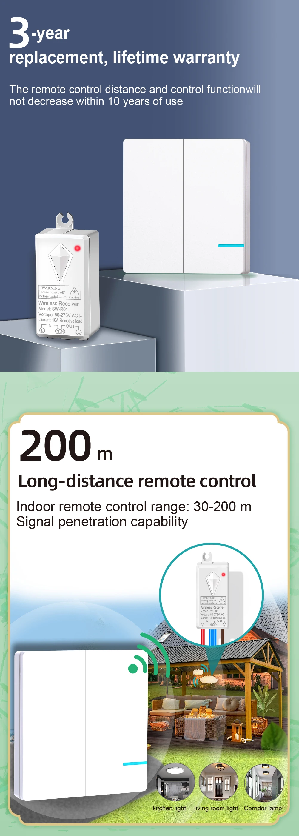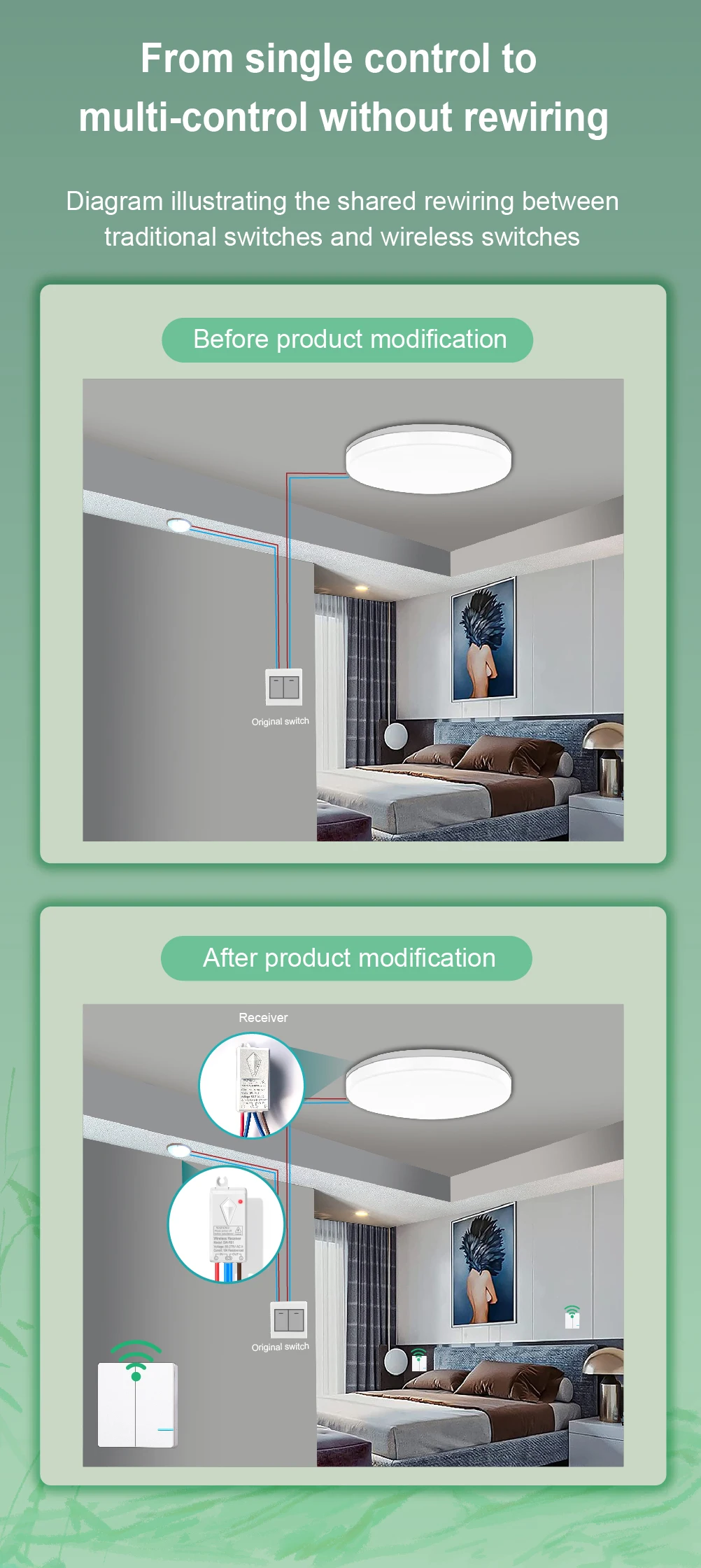 Belaidžio jungiklio pagalba galima be didelių investicijų (elektros instaliacijos keitimo) valdyti apšvietimą ar kitą įranga iš kelių vietų.