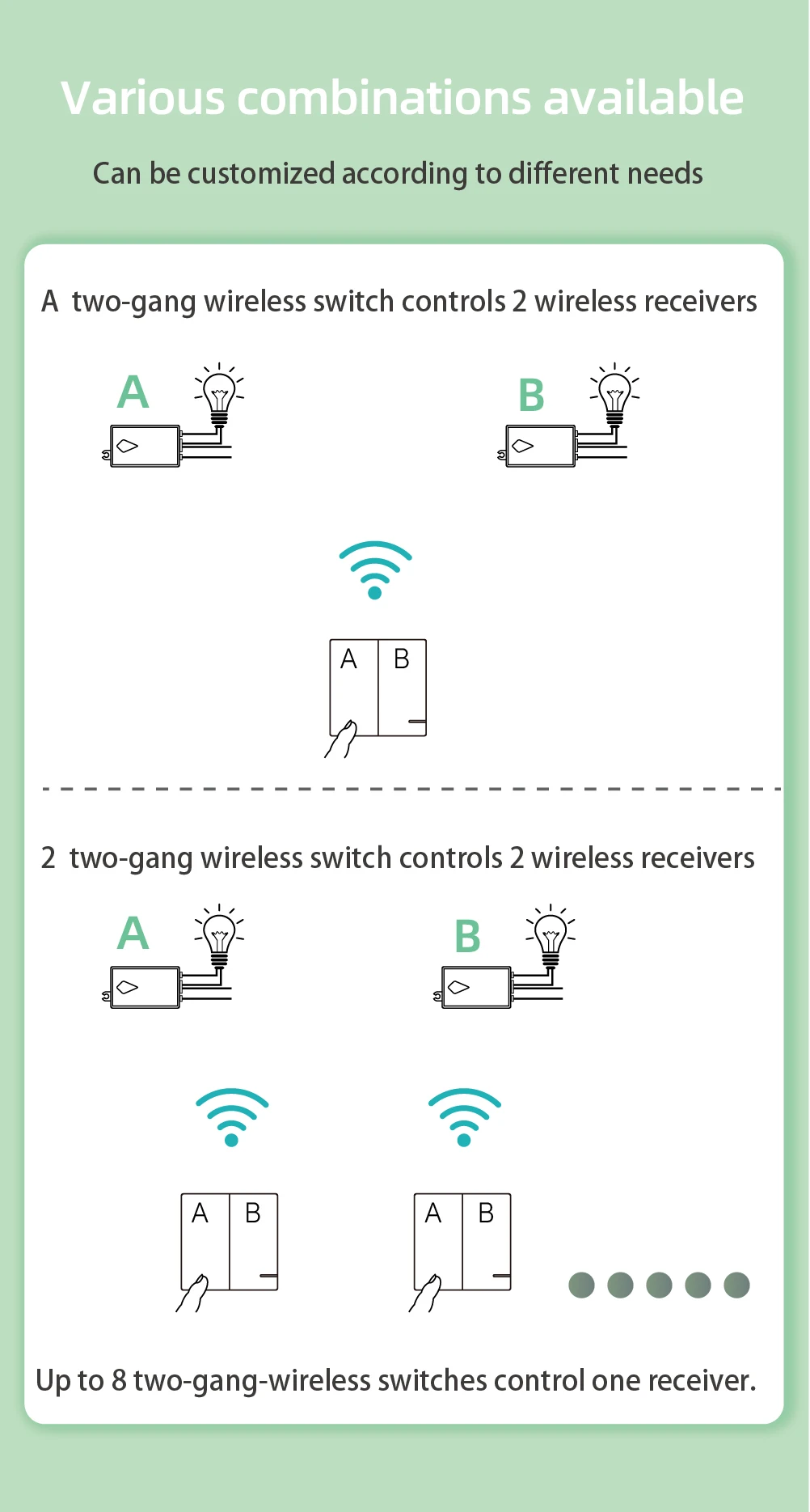 Pvz. Laiptinėse, koridoriuose ir kituose patalpose. Maksimaliai vienam įrenginiui galima prijungti iki 5 belaidžių jungiklių.